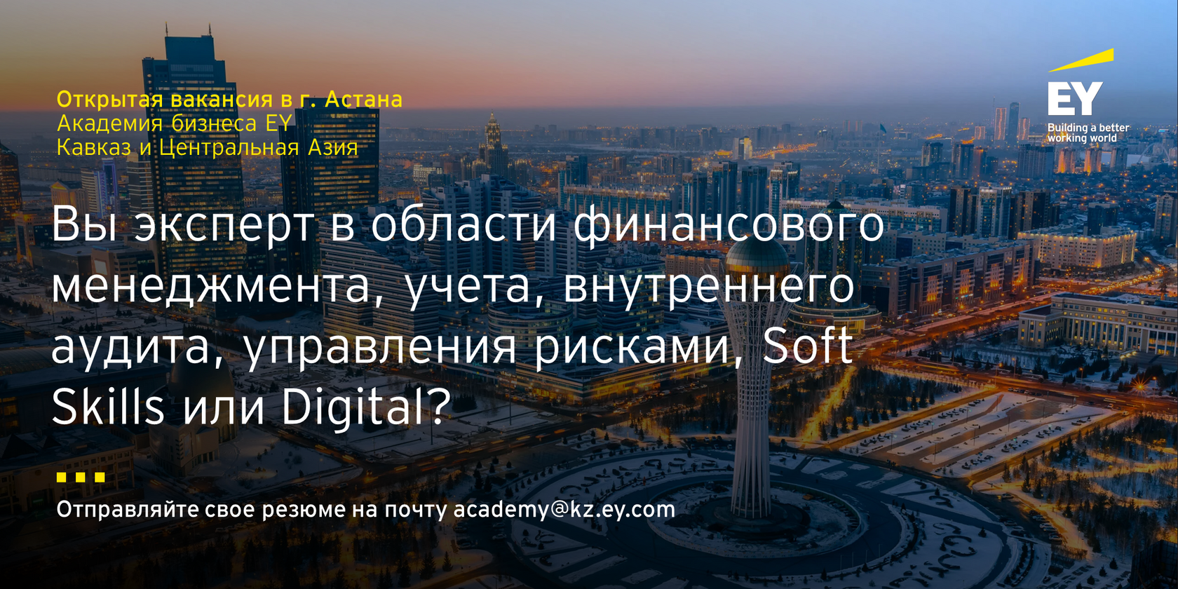 📌 Будем рады, если вы порекомендуете нам ваших друзей или знакомых. 📆Дедлайн подачи резюме: 13 августа. Резюме просим направлять на следующий адрес: academy@kz.ey.com. |